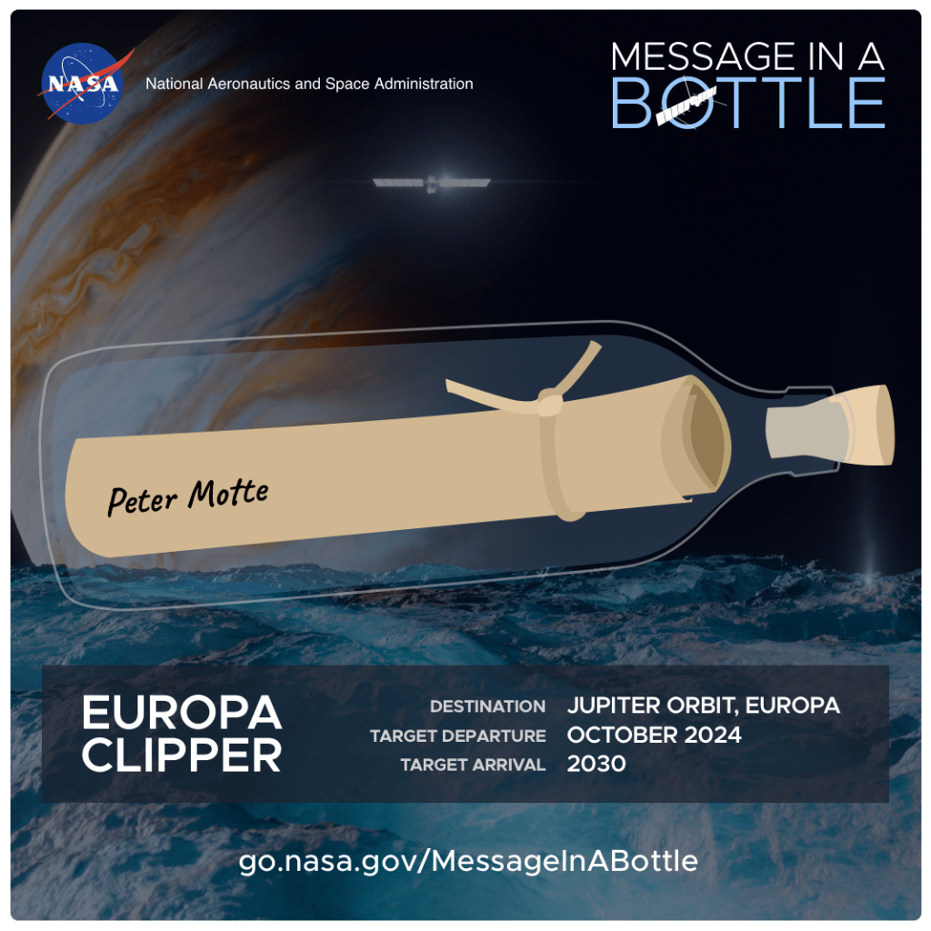 Ook deze keer maakt Nasa het mogelijk om “mee te reizen” met een kunstmaan. “Meereizen” betekent dat je naam via deze inschrijving wordt gegraveerd op het ruimtetuig Europa Clipper van Nasa. Technici van het Microdevices Laboratory in NASA’s Jet Propulsion Laboratory in Zuid-Californië zullen met een elektronenstraal de naam graveren op een silicon microchip ter grootte van stuk van 10 cent van een Amerikaanse dollar. Elke regel tekst is kleiner dan 1/1000e van de dikte van een menselijk haar (75 nanometer).
